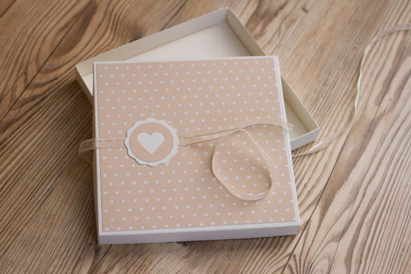 Um die Stabilität der Schachtel zu schaffen, wird im Boden und im Deckel eine Pappe eingearbeitet. Das Fotobuch wird mit einer kleinen Satinschleife, die im Boden mit eingearbeitet ist, angehoben für leichtest herausnehmen des Buches.