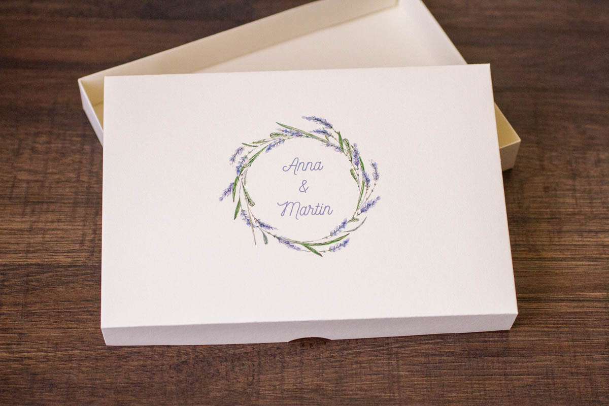 Die Fotoschachtel wird in der Farbe perlweiß angefertigt und wie abgebildet bedruckt mit Ihren angegeben Daten.