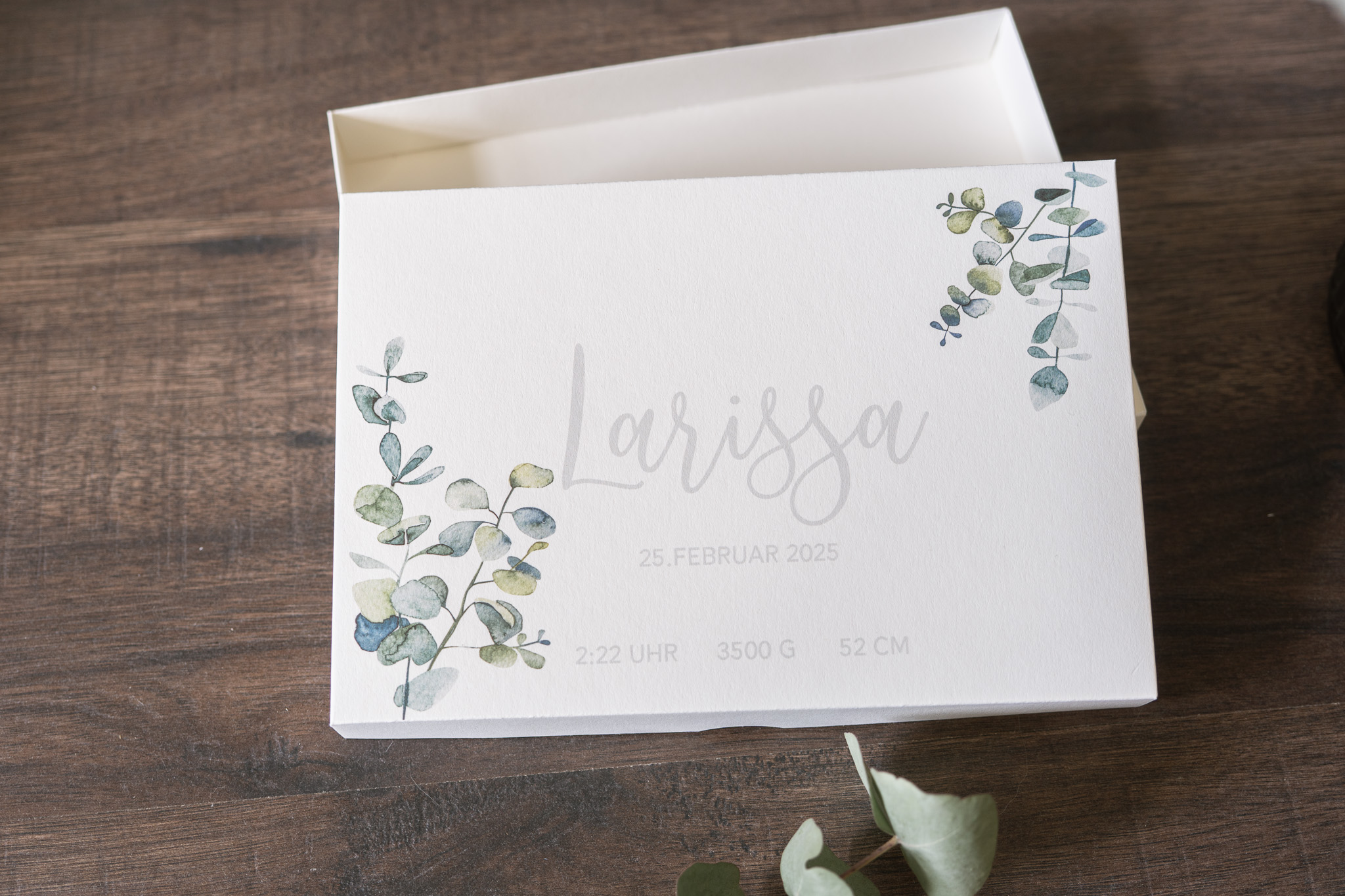Die Fotoschachtel wird in der Farbe perlweiß angefertigt und wie abgebildet bedruckt mit Ihren angegeben Daten.