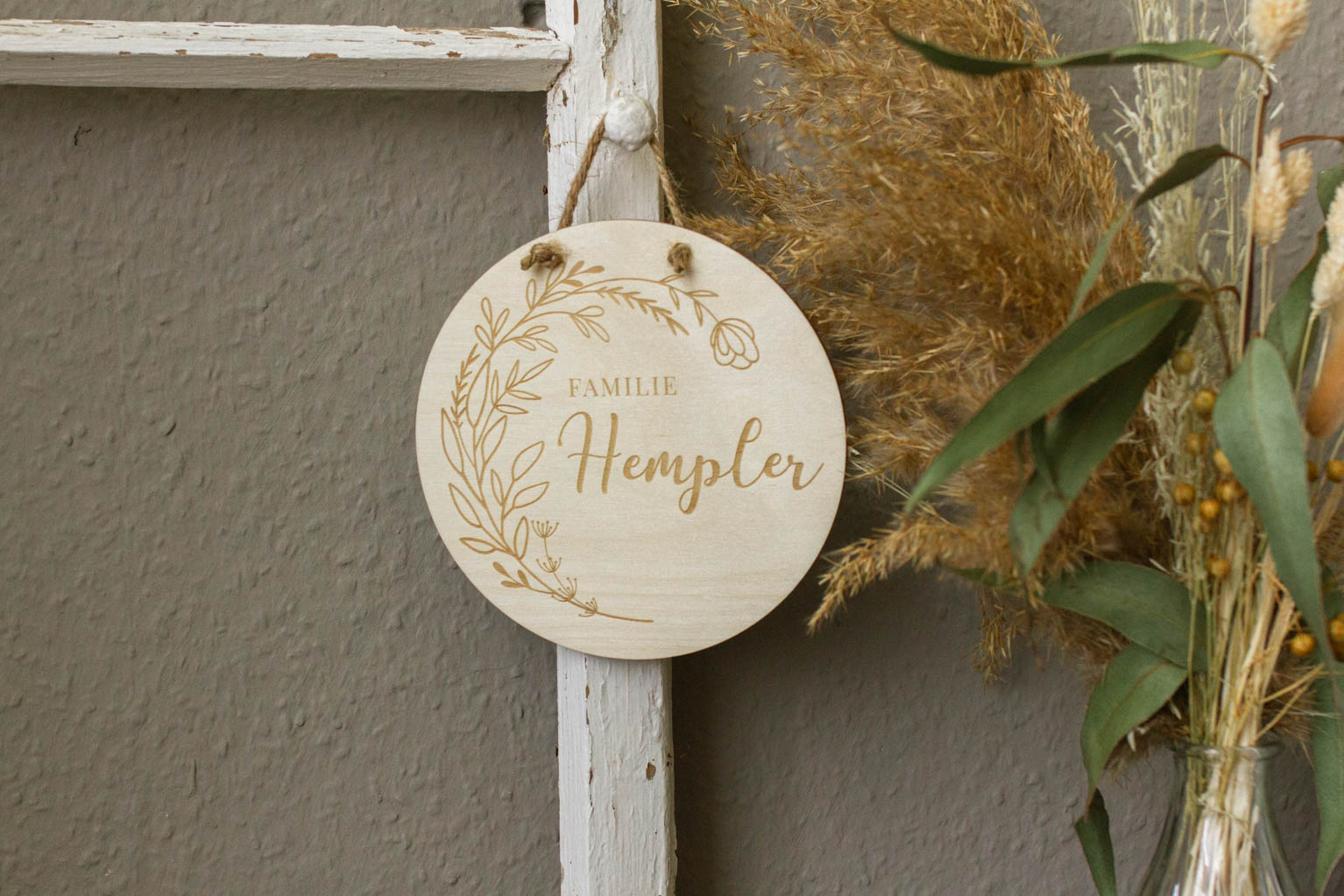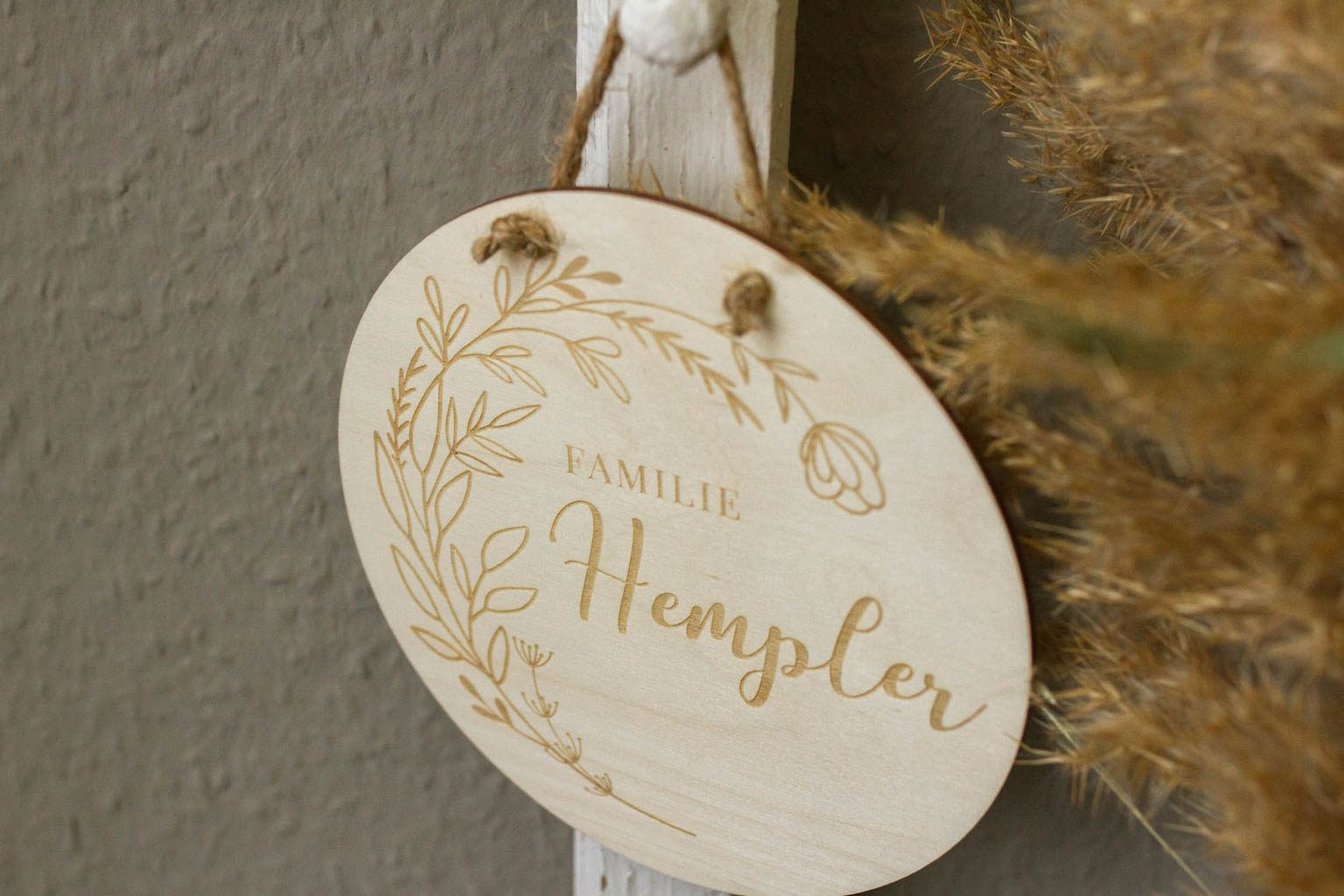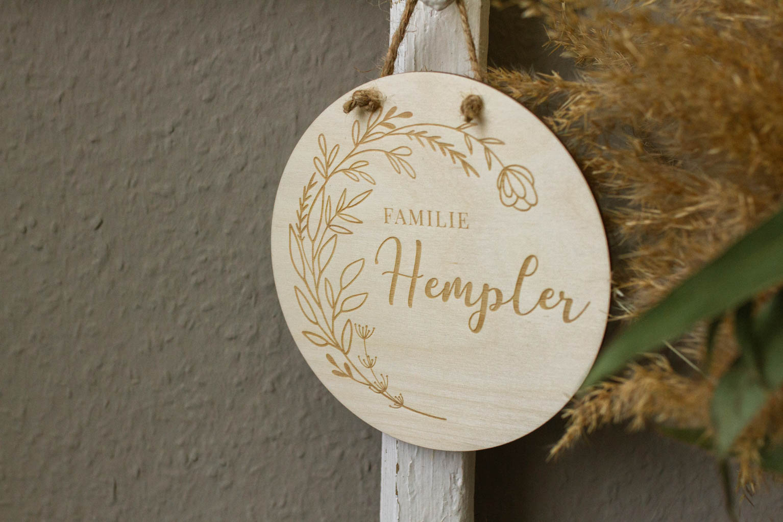 Das Holzschild wird nach Ihren angaben graviert, Bsp. Familie Hempler. Dieses Schild ist ein Naturprodukt, somit ist die Farbe und Maserung je Schild unterschiedlich. Gewisse Schmauchspuren entstehen produktionsbedingt und sind ebenfalls kein Reklamationsgrund.