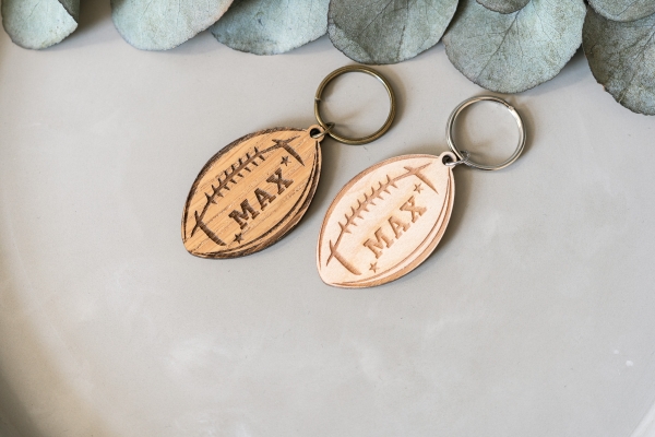 Dieser hochwertige Schlüsselanhänger in Football-Form ist das ideale Accessoire für alle Football-Liebhaber! Er wird aus edlem Eichen- oder Birkensperrholz gefertigt und mit einer individuellen Gravur versehen. Ob dein eigener Name, ein Lieblingsspieler oder ein besonderes Datum – wir machen es möglich!