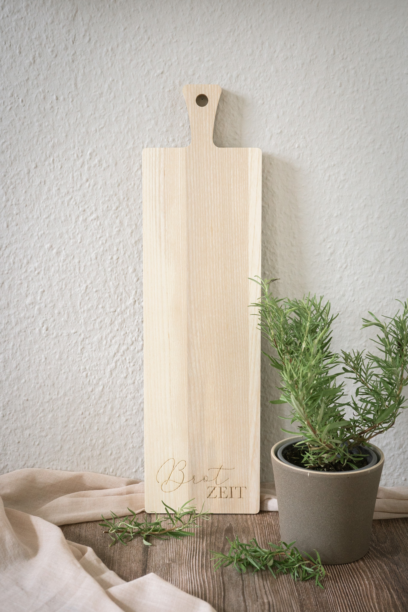 Unser längliches Schneidebrett mit Griff aus Esche ist das perfekte Accessoire für jeden, der Baguettes oder Meterbrot liebt. Auch eine schöne Geschenkidee für eine Hochzeit, Kochliebhaber, Geburtstage, Grillmeister ect.