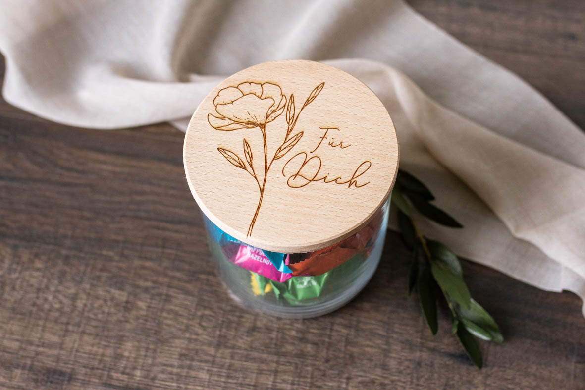 Ideal als Geschenkidee um kleine Naschereien schön zuverpacken. Dieses Vorratsglas wird wie abgebildt graviert, mit Motiv und Schriftzu "Für Dich".