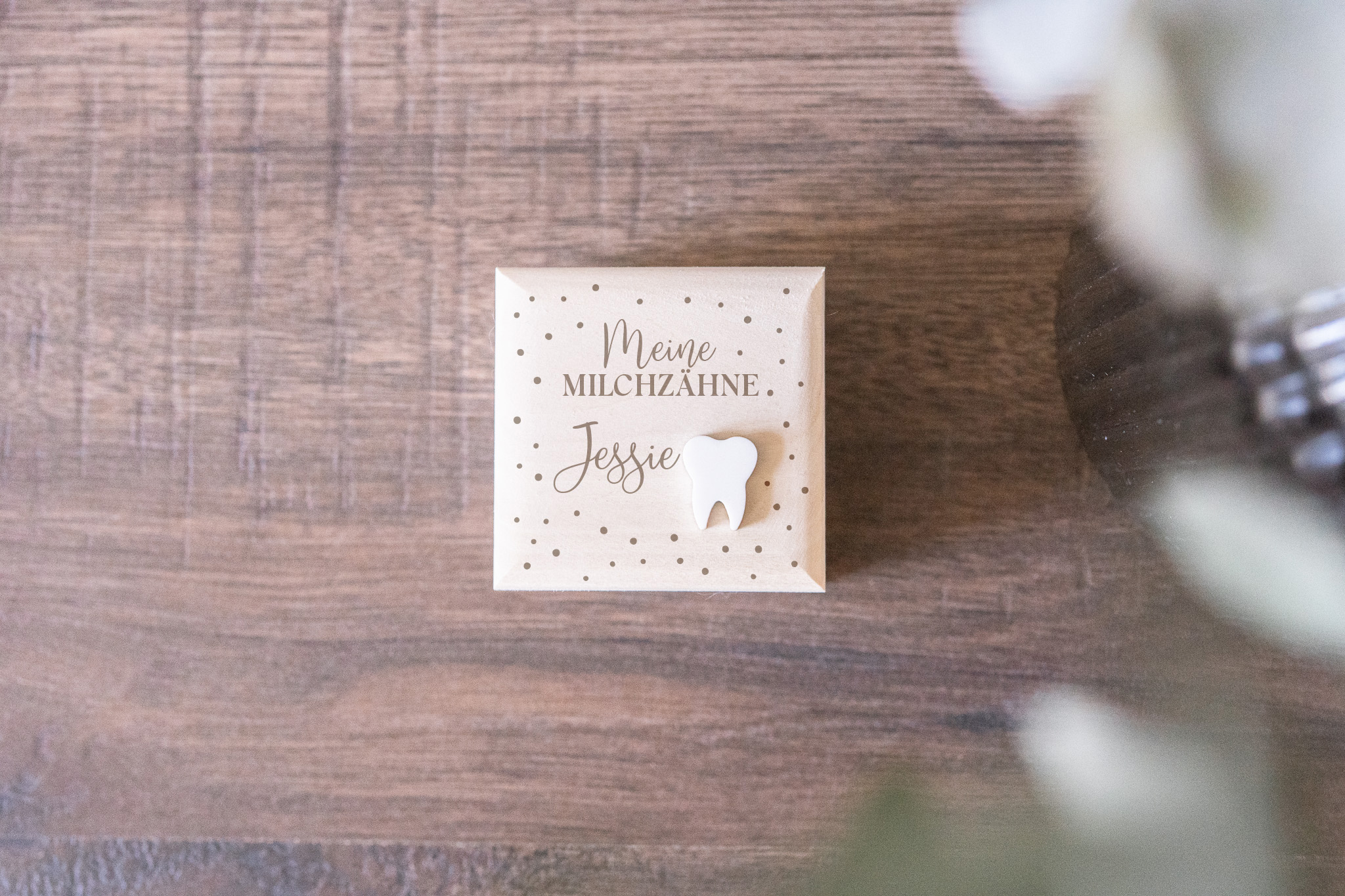 Die süße Milchzahndose ist mit feinen Details gestaltet und enthält eine dekorative Zahn-Applikation. Durch die personalisierte Gravur wird sie zu einem einzigartigen Erinnerungsstück.