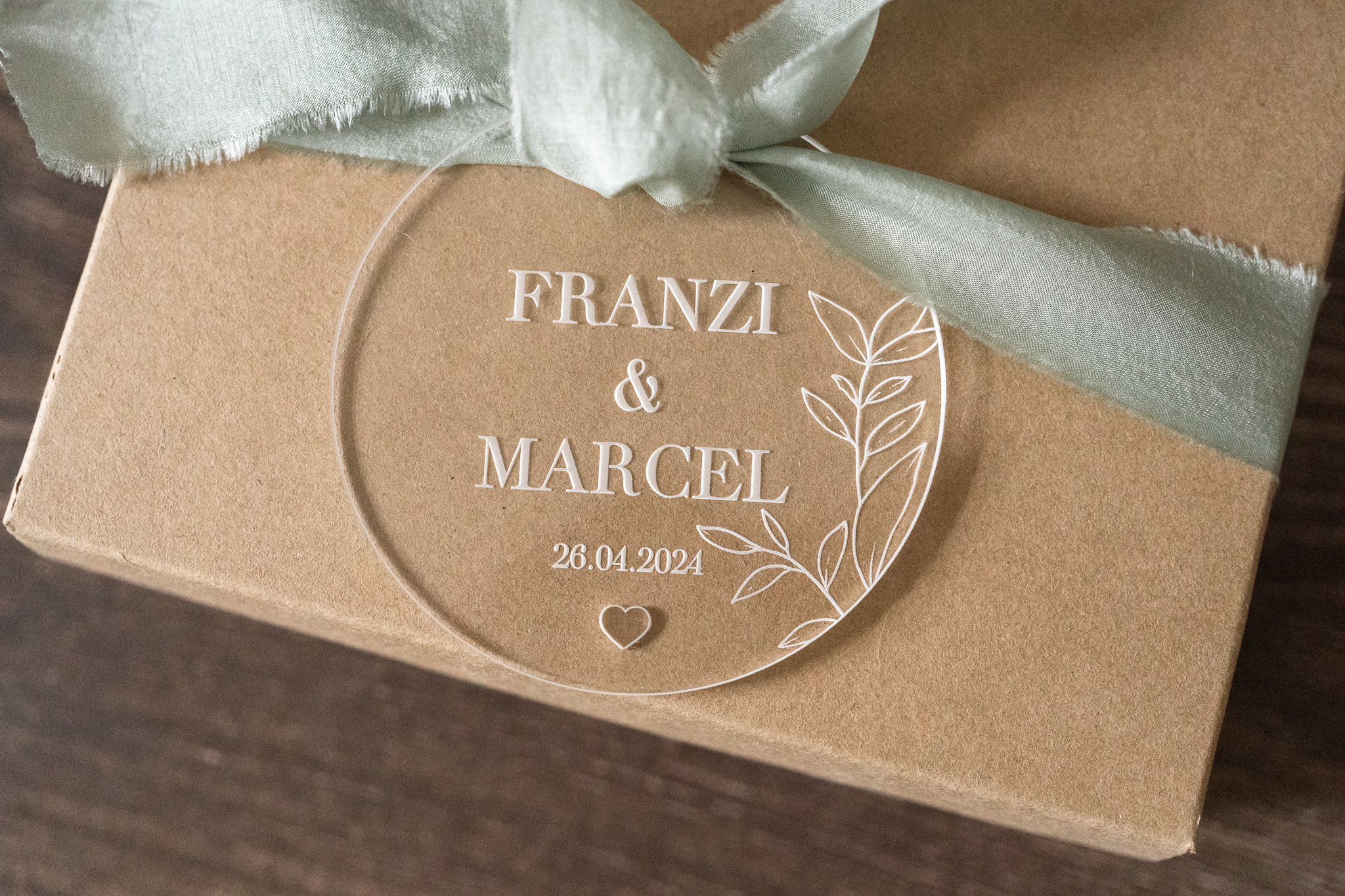 Dieser wunderschöne Anhänger zieht alle Blicke auf sich. Mit seiner eleganten Milchglas-Acryl-Oberfläche oder klaren Acryl eignet er sich perfekt als Geschenkanhänger zur Hochzeit. Der Hintergrund besteht aus hochwertigem Milchglas-Acryl oder klarem Acryl, während die Schrift auf das Acryl und das Muster graviert weird. Bitte geben Sie bei der Bestellung direkt an, welche Gravur auf dem Anhänger erscheinen soll.