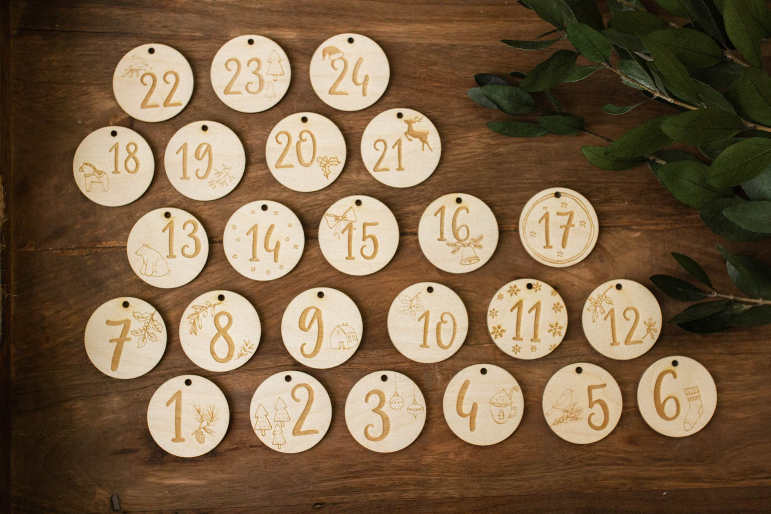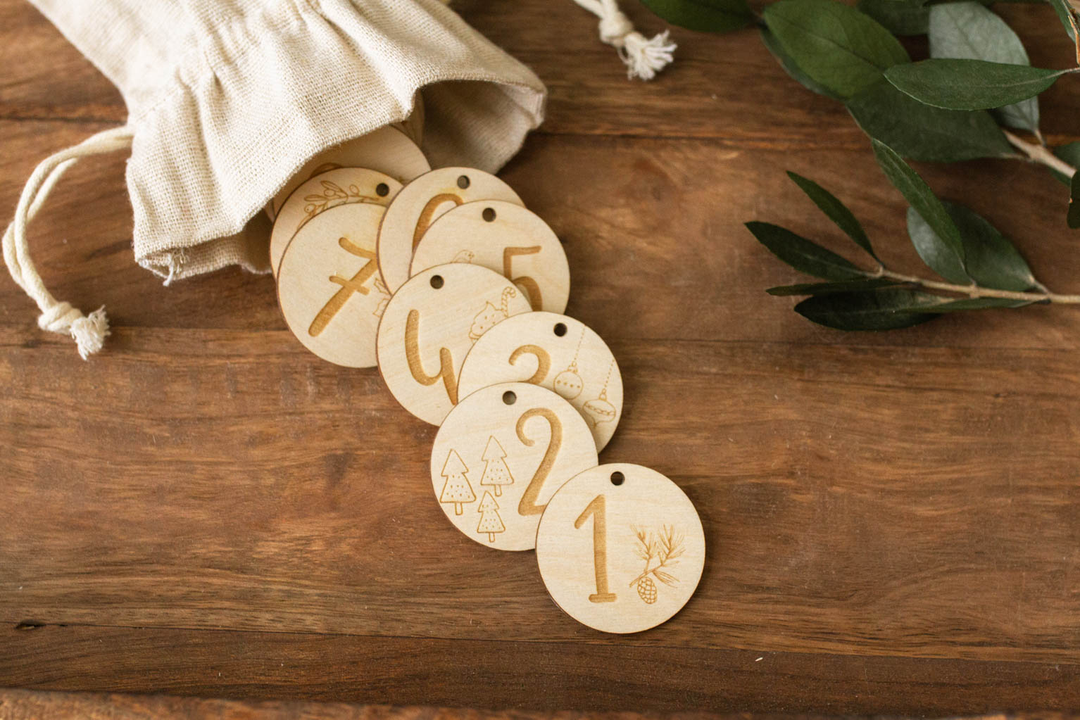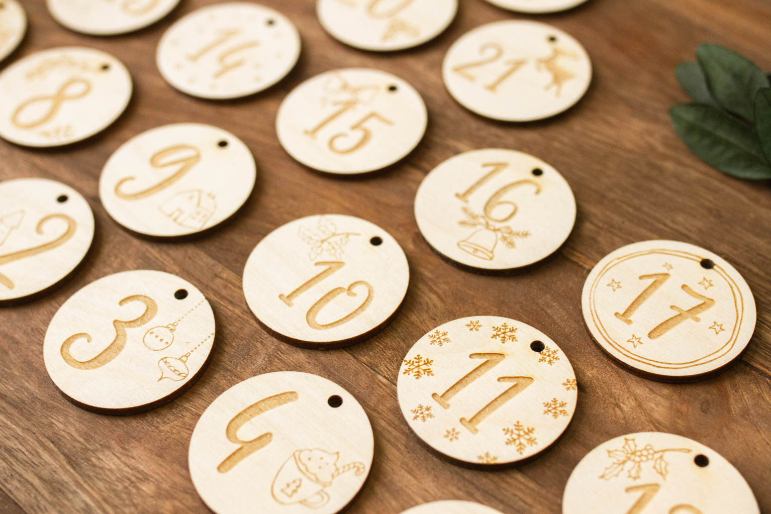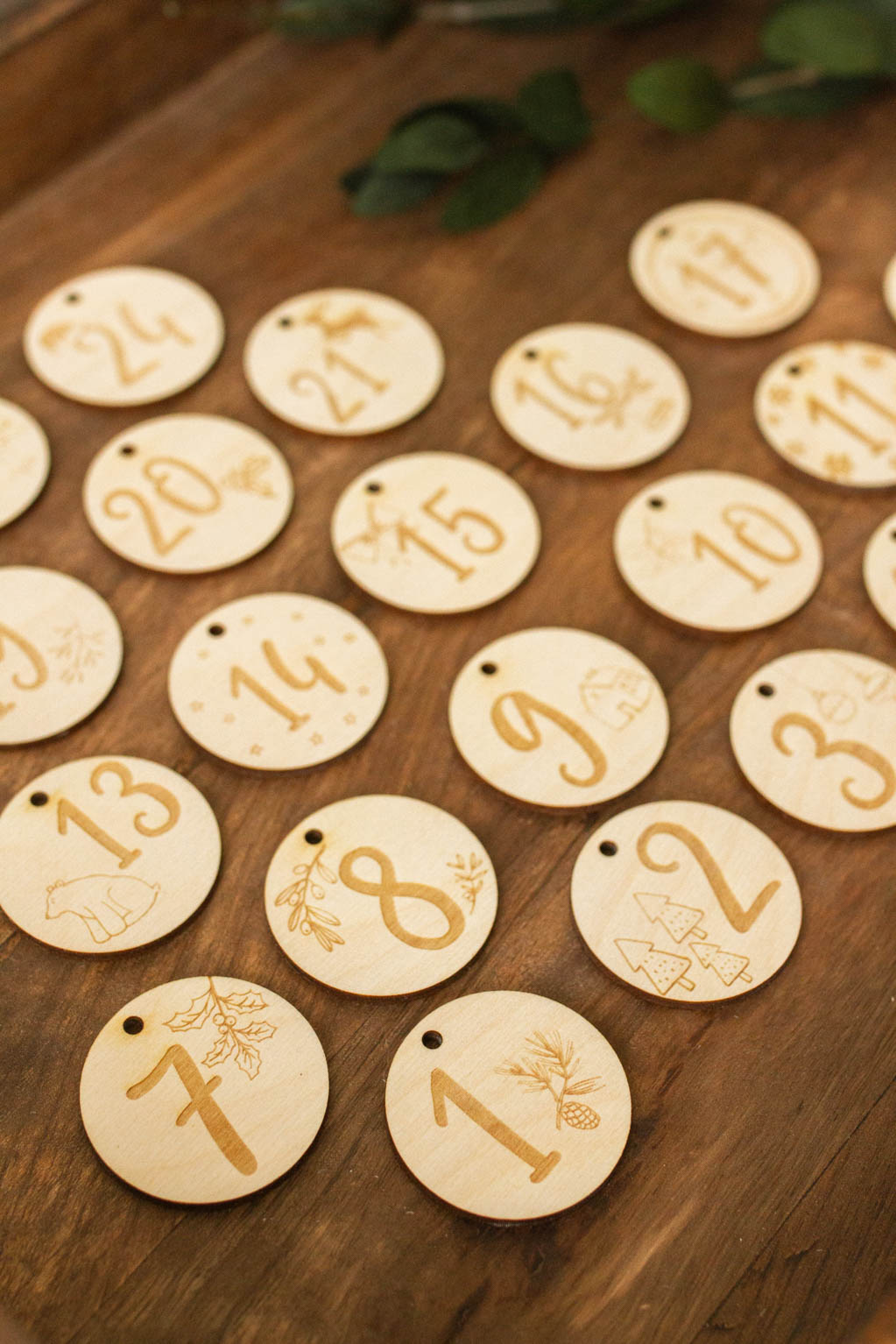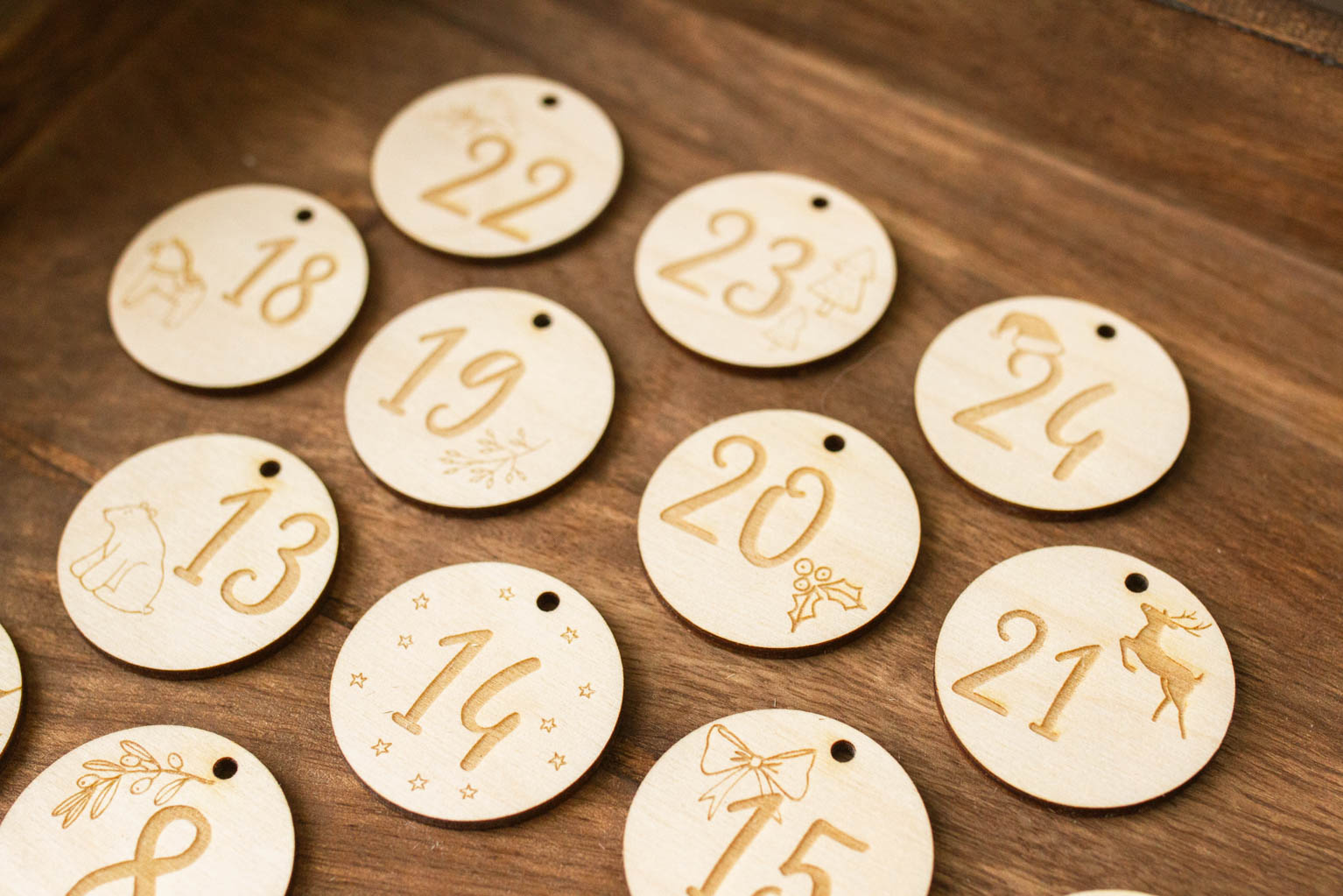 Holzanhänger für den Adventskalender. Diese Anhänger sind von 1 bis 24 graviert mit Weihnachtlichen Motiven und hübschen den Adventskalender auf.
