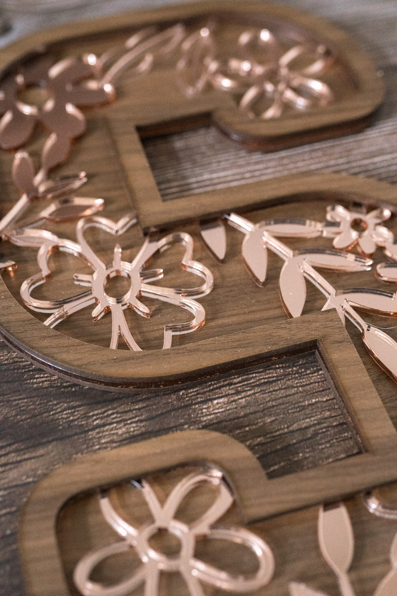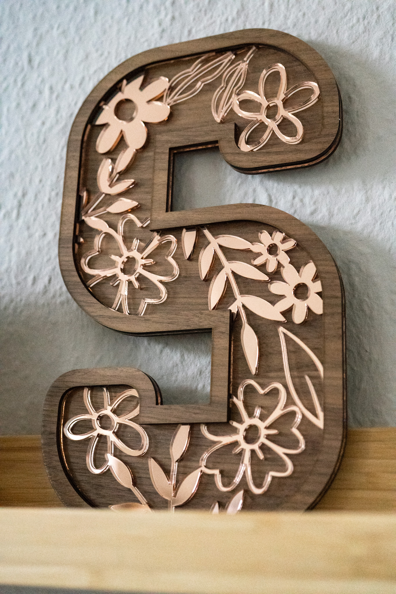 Dieser stilvolle Buchstabe im floralen Design wird mit viel Liebe zum Detail aus hochwertigem Holz und Acryl gefertigt. Die filigranen Blumenmuster verleihen ihm eine einzigartige Eleganz. Die Mittellage kann individuell in einer Acrylfarbe oder Holz gewählt werden, während der Rahmen und der Hintergrund immer aus edlem Holz in der Farbe Walnuss gefertigt sind.