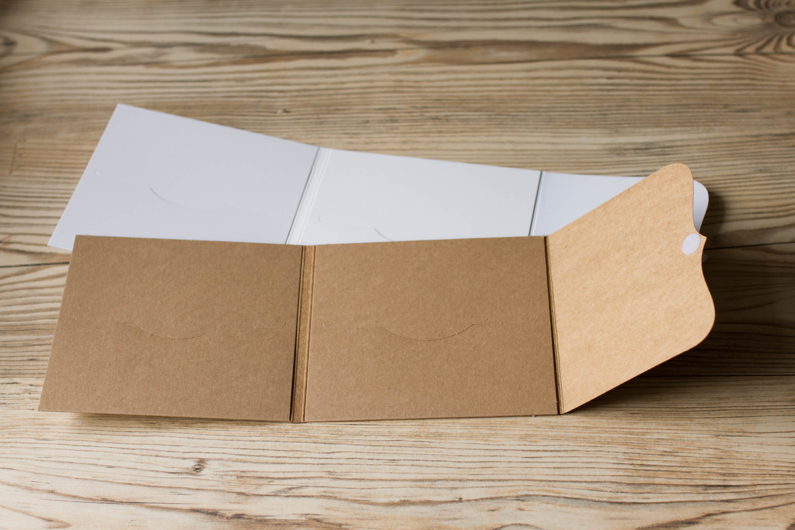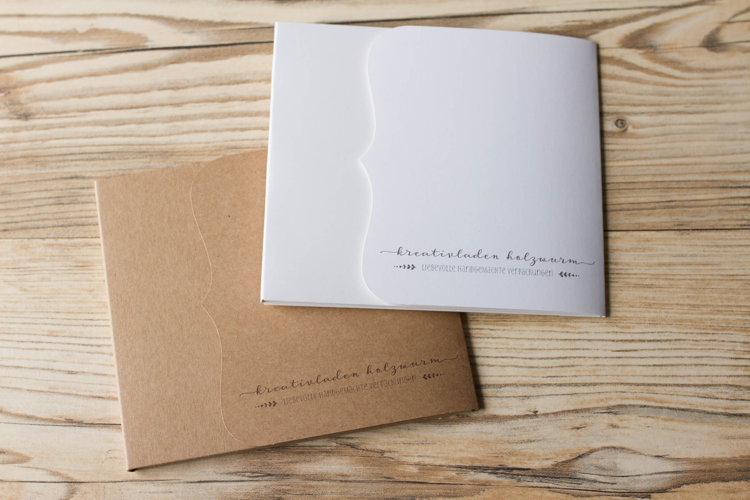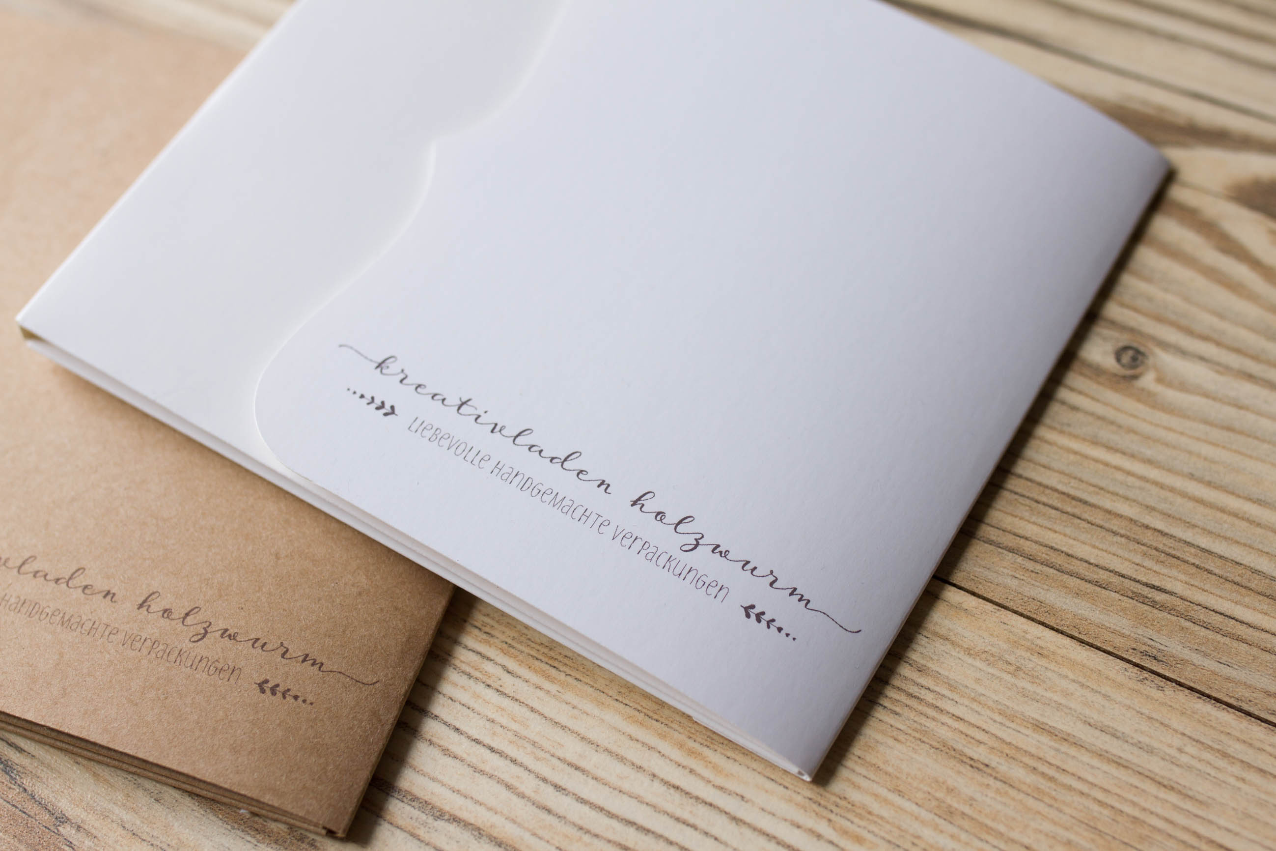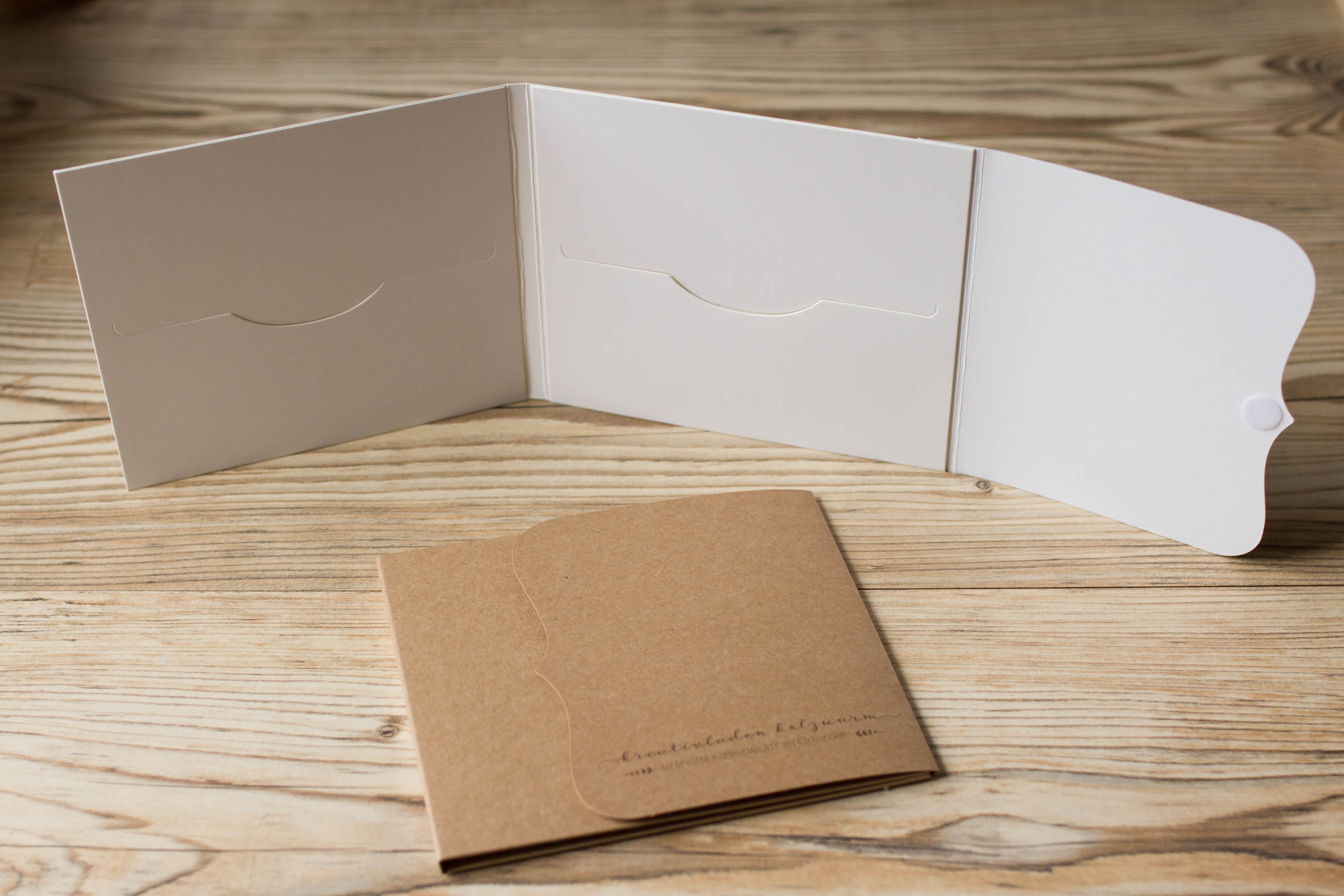 Die vorgefertigte CD Hülle gibt es in den Farben weiß und braun. Es passen 2 CD´s rein. Mit Logodruck möglich. Zum Verschluss der Mappe mit Magnet oder Klettverschluss.