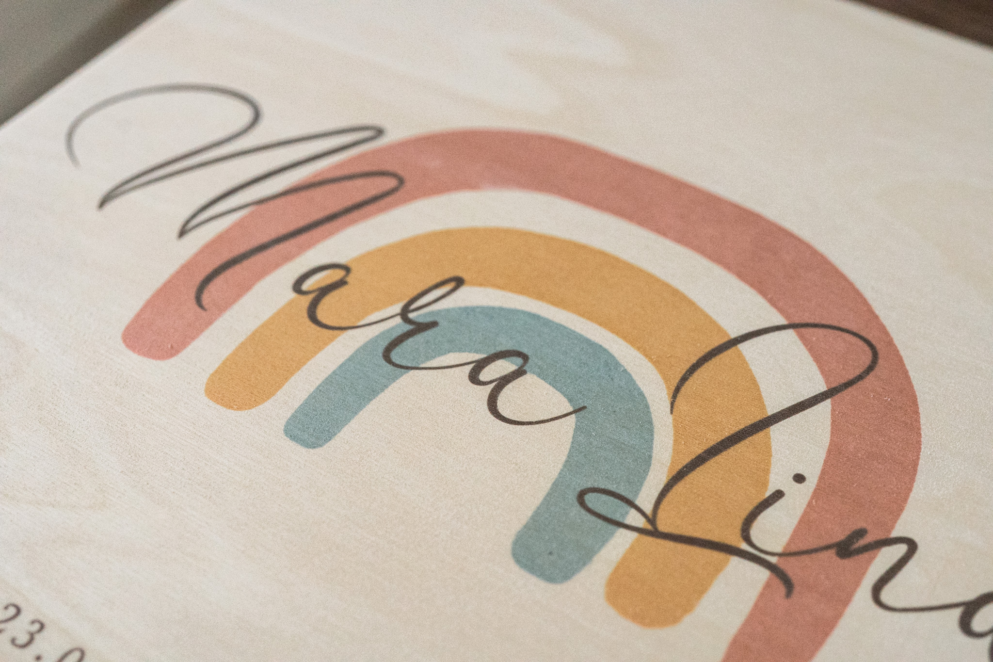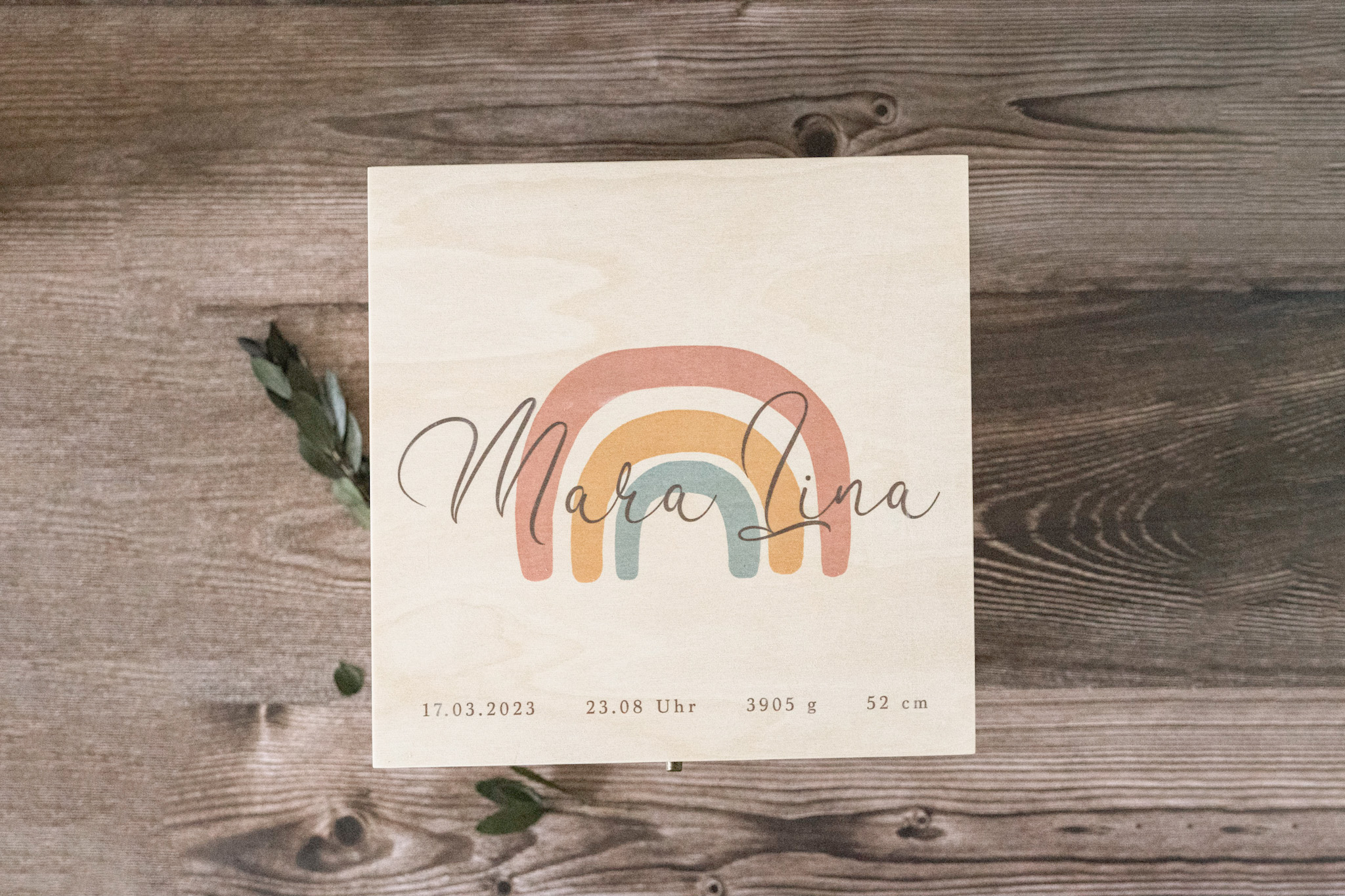 Wunderschöne Holzbox mit personalisierte UV Druck und eine tolle Geschenkidee zur Geburt als Erinnerungskiste.
