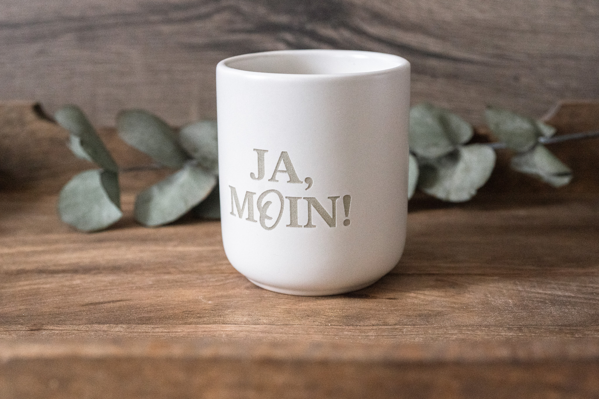 Mit dem Keramikbecher „Ja, Moin!“ beginnt jeder Tag mit einem Lächeln.