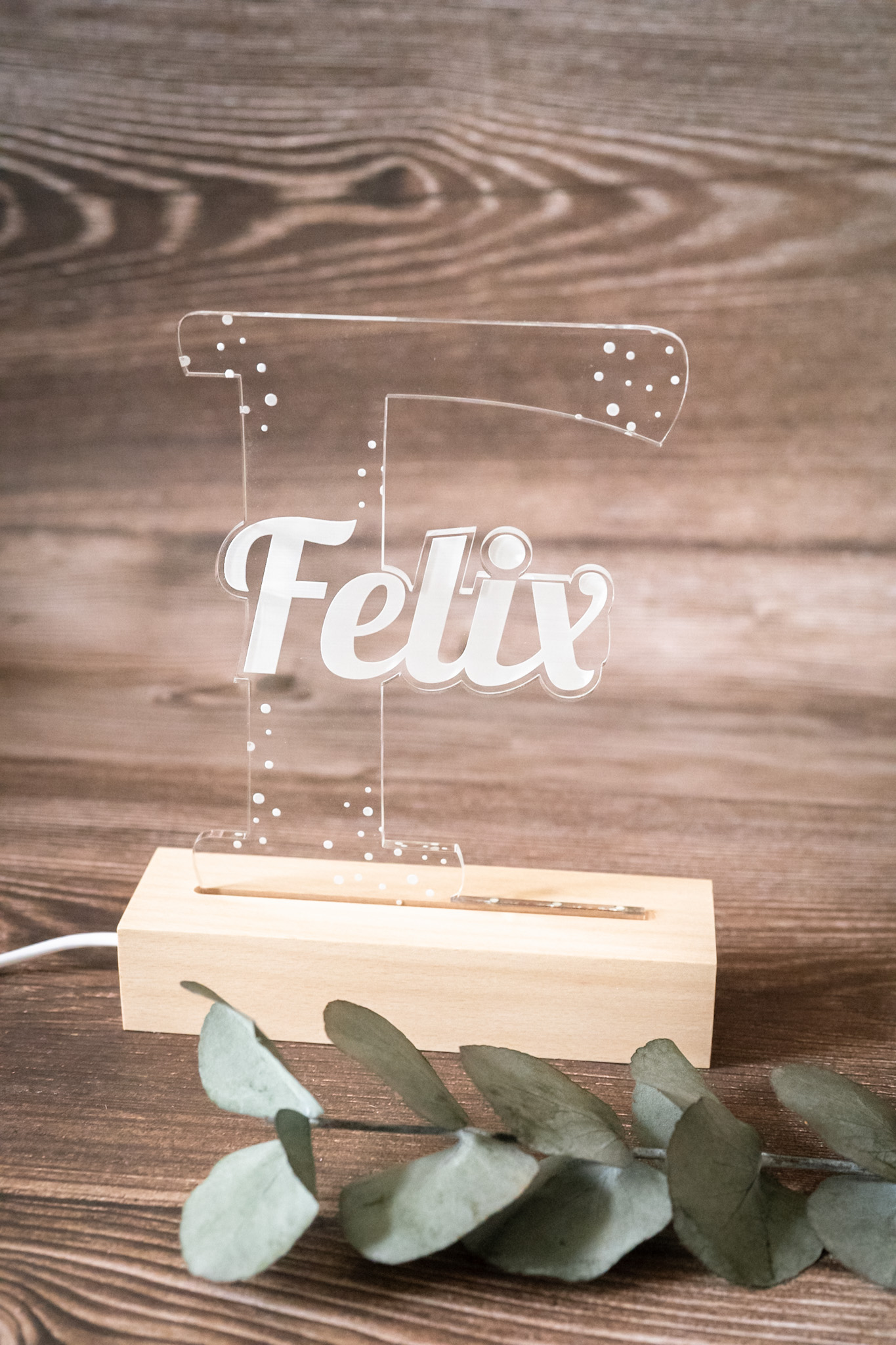 Personalisiertes Nachtlicht in Buchstabenform mit LED-Lichtsockel aus hochwertigem Holz, elegant und langlebig. Helle bunte LED-Lampen zeigen sehr schönes Acryl und schaffen eine romantische Atmosphäre.