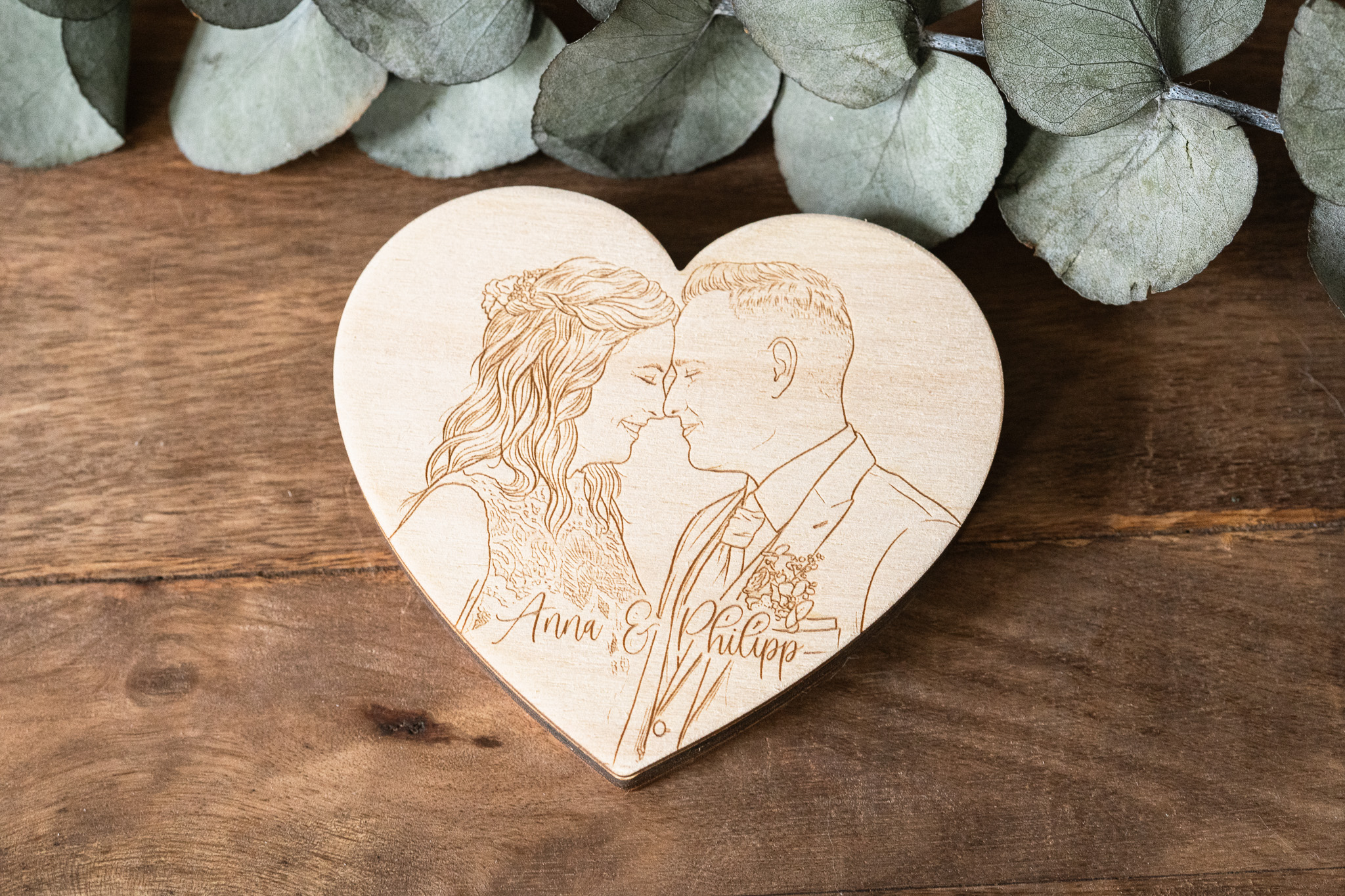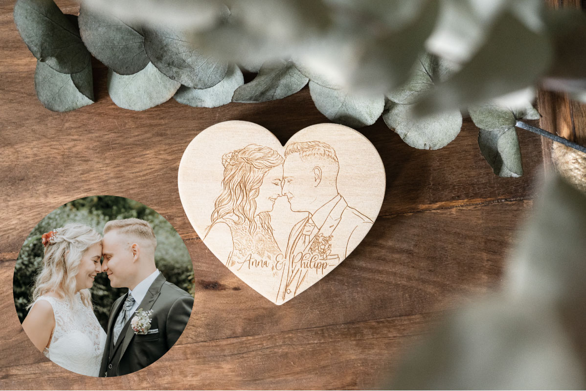 Herzförmige Holzbox mit Foto-Gravur (Brautpaar) und Namen, dahinter USB-Stick aus Holz in passender Aussparung