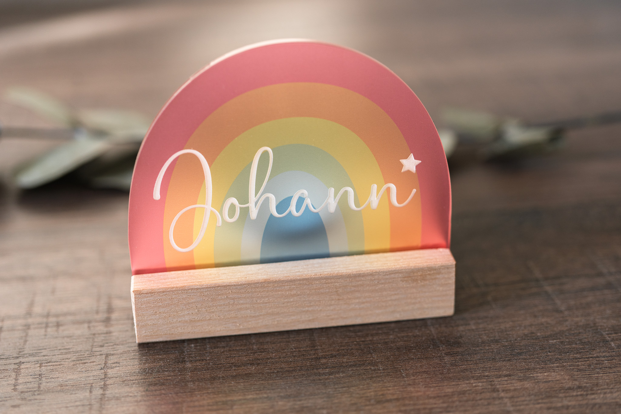 Der Regenbogen wird in einen hochwertigen Holzsockel gesteckt und wirkt durch das sanfte Farbspiel und die feine Gravur besonders stilvoll und tröstlich. Auf Wunsch kann der Name des Sternenkindes eingraviert werden – ein liebevolles, individuelles Andenken, das Trost spendet und die Erinnerung lebendig hält.