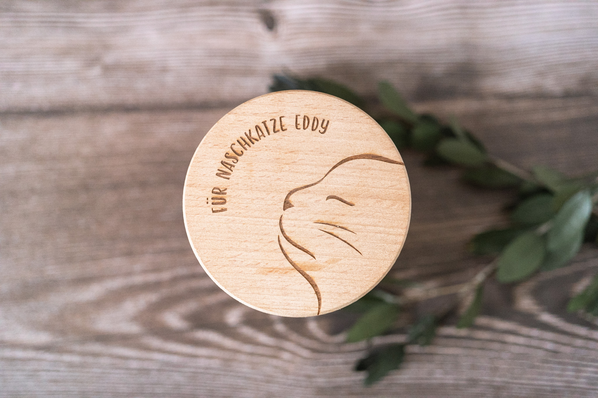 Aufbewahrungsglas für kleine Naschkatzen und Ihre Leckerlies. Dieses Vorratsglas wird wie abgebildt graviert, mit Motiv und Schriftart.